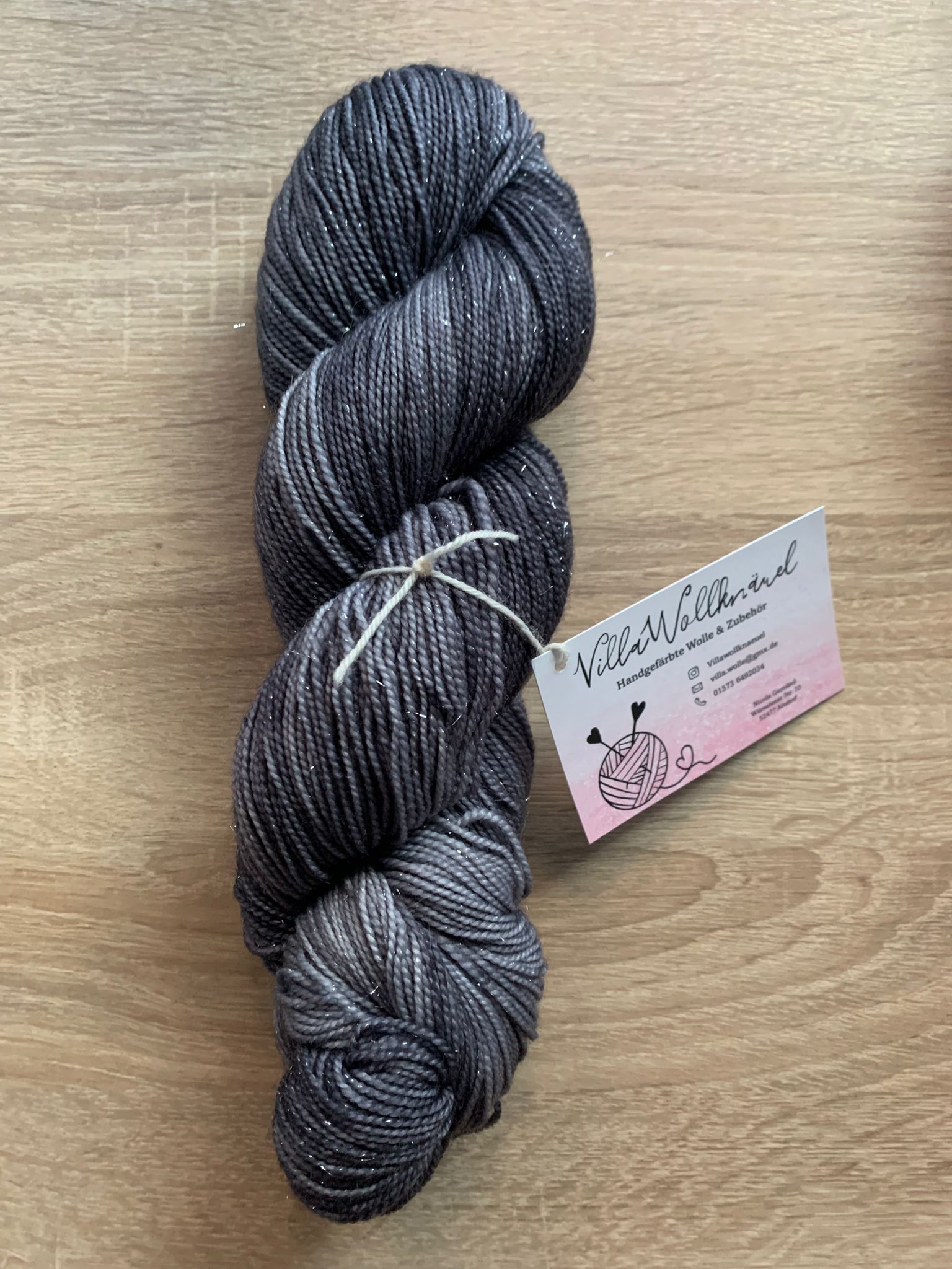 Diese Wolle hat einen feinen Glitzerfaden , der das dunkle grau schwarz edel wirken lässt. Natürlich für alle Strickstücke geeignet.