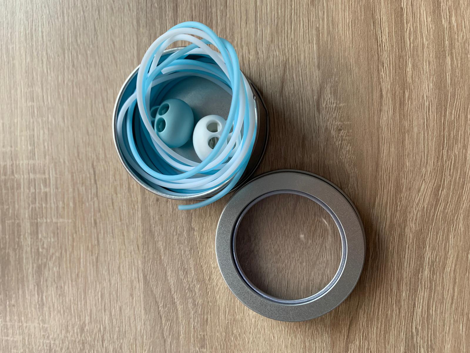 Es gibt 2 Silikonseile, 1 in hellblau, 1 in weiß. Jedes Seil hat eine Länge von ca. 1,5 m und kann somit zum Stilllegen der Maschen für Ärmel und Körper bei Bedarf zugeschnitten werden.