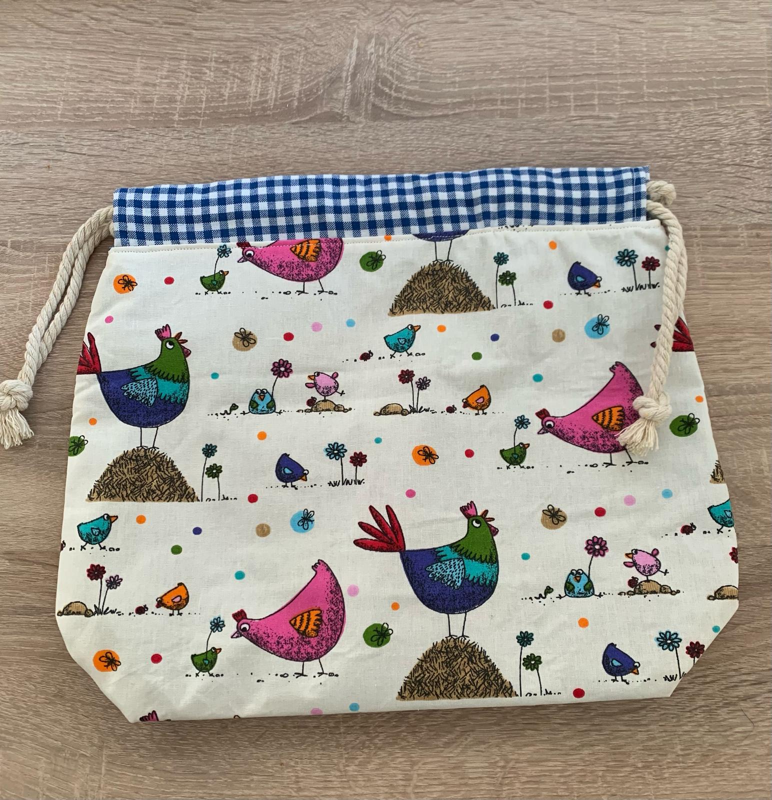 Eine farbenfrohe große Projekttasche mit Hühnermotiv