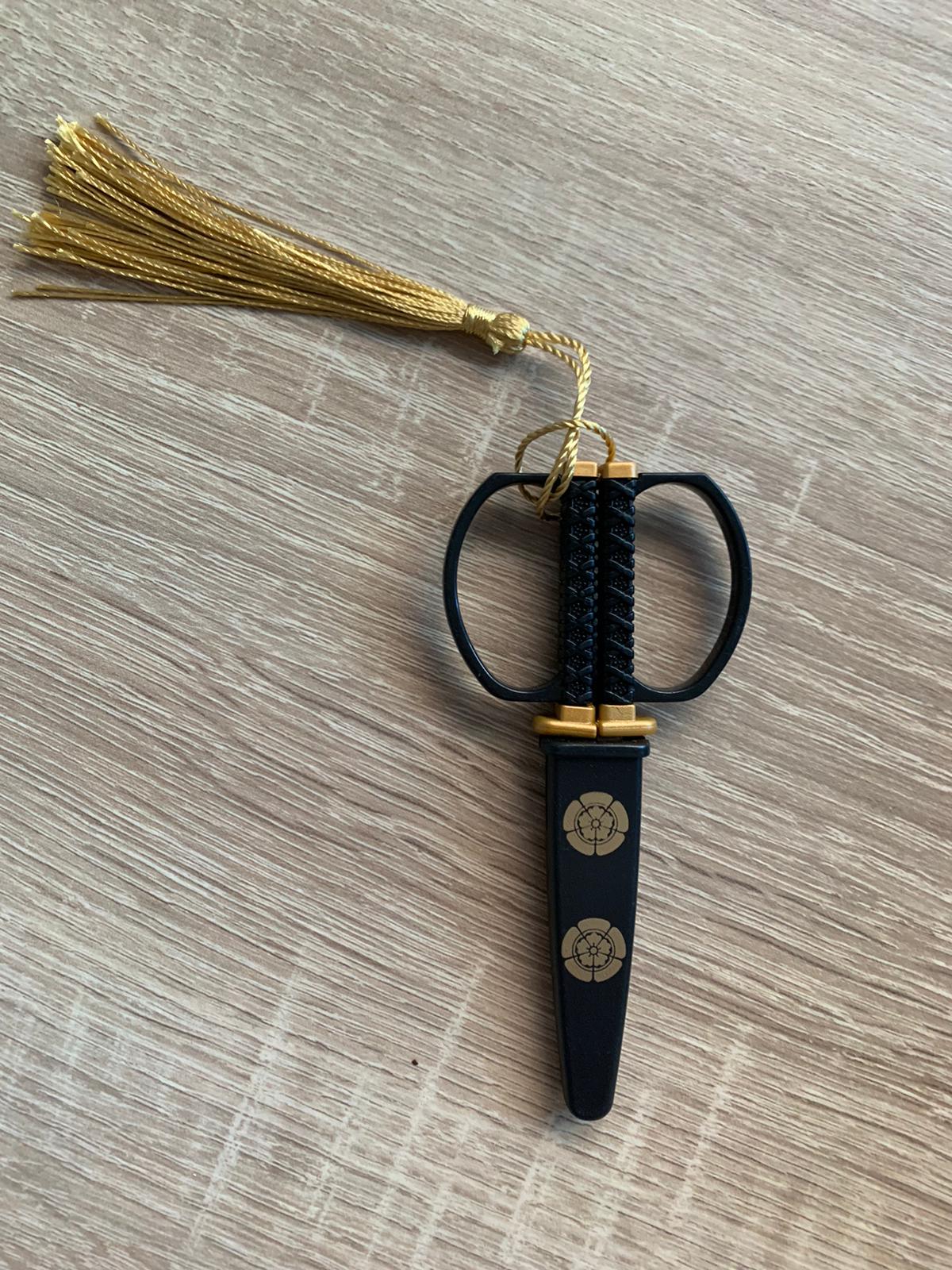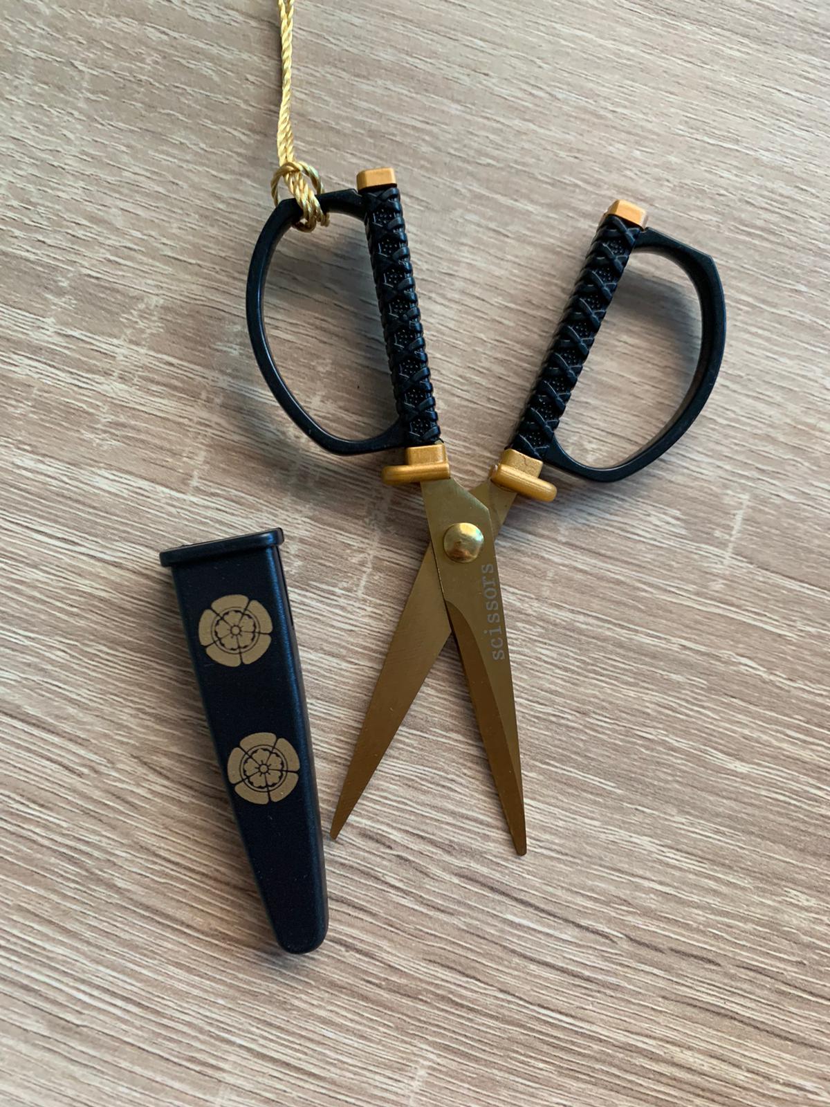 Schwarz-goldene Schere mit Schutzhülle und Quaste.
