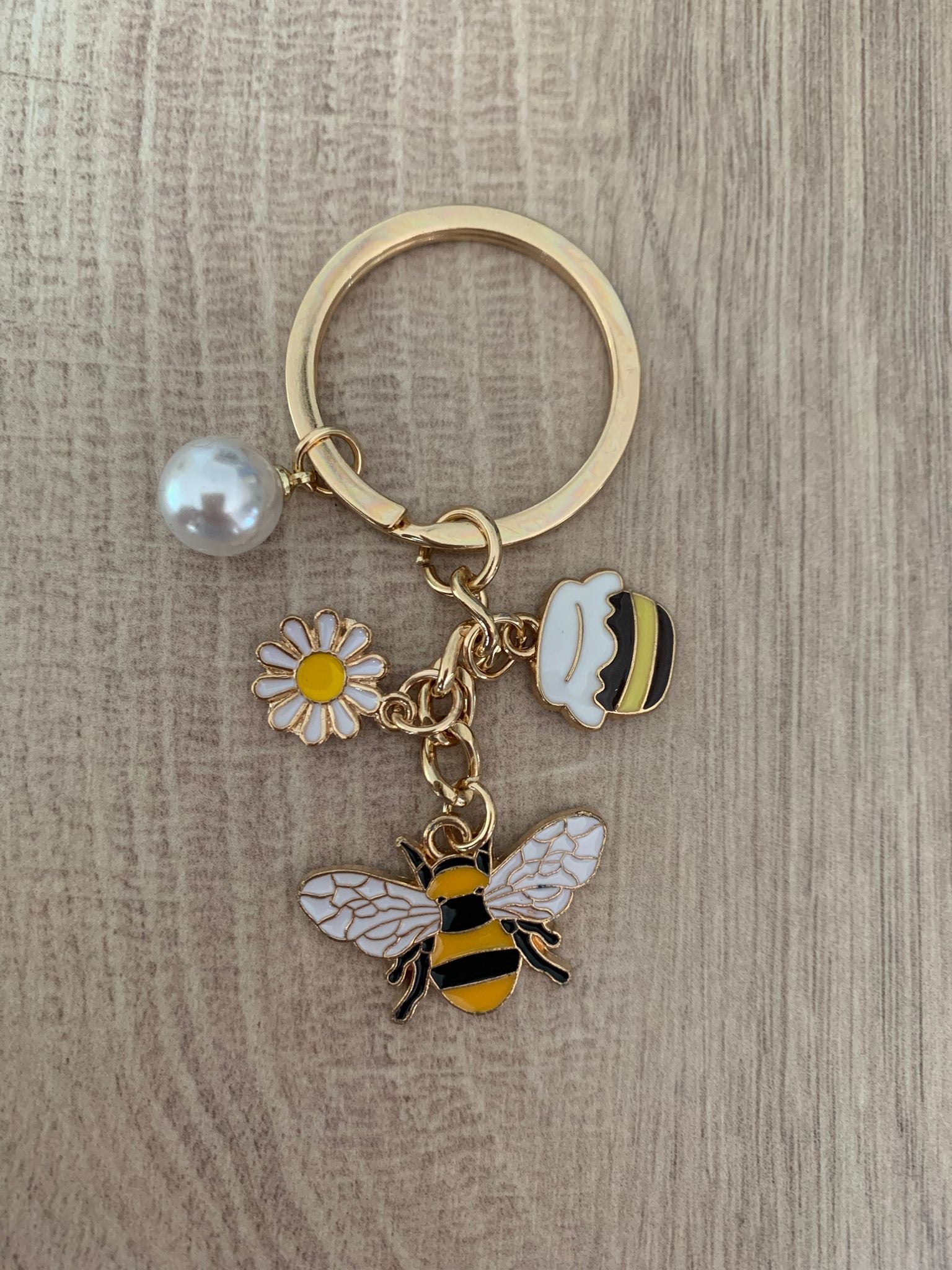 Einen Schlüsselanhänger mit Biene, Honigtopf, Blume und Perle