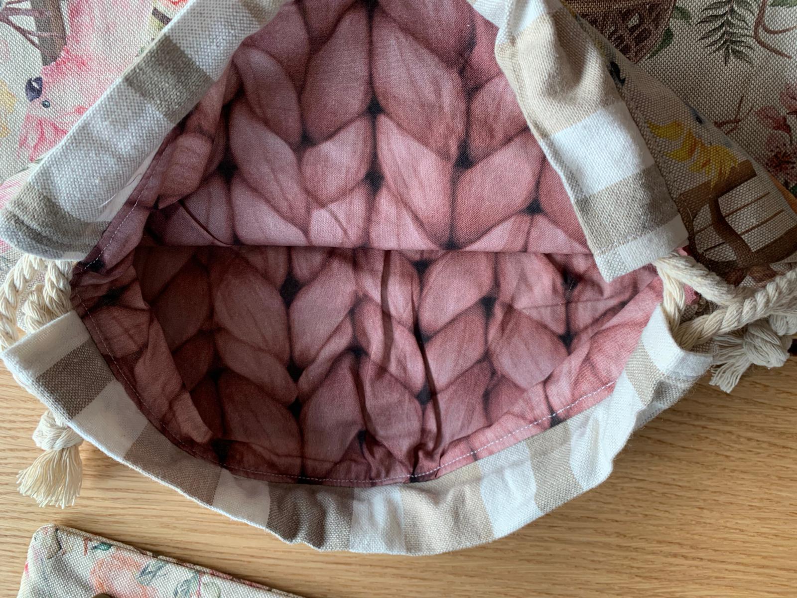 Diese XL-Projekttasche ist geeignet, um deine Stränge für ein Pullover- oder Jackenprojekt zu beherbergen. Die Tasche ist aus einem robusten Dekorstoff genäht. Innen ist sie mit einem floralem Baumwollstoff gefüttert und mit Vlies verstärkt. Geschlossen wird sie mit stabilen Zugkordeln und einem Tunnelzug.
